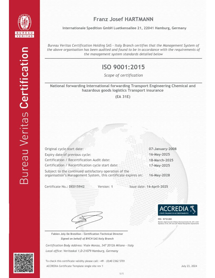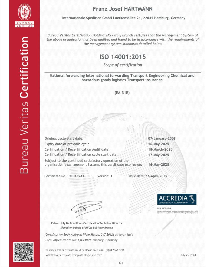 Franz Josef Hartmann, Hamburg has been audited and certified through Bureau Veritas Quality International for DIN EN ISO 9001/1994 standards since February 1996, and recertified 2022 by Bureau Veritas in accordance with DIN EN ISO 9001/2008 and ISO 14001/2009 standards. Regular audits and respective re-certifications assure a continuous high quality standard.